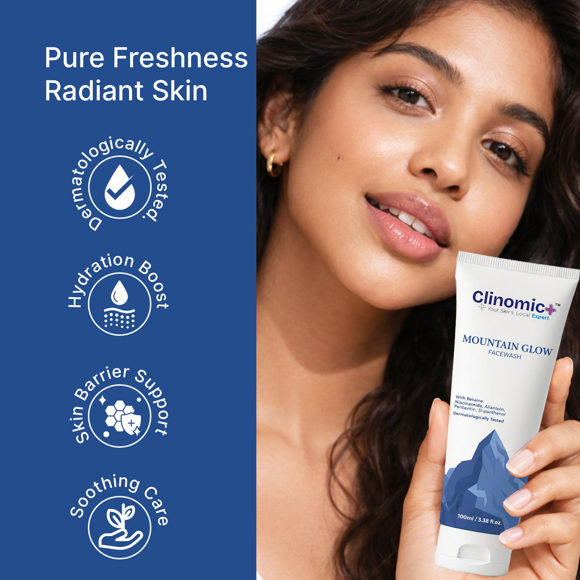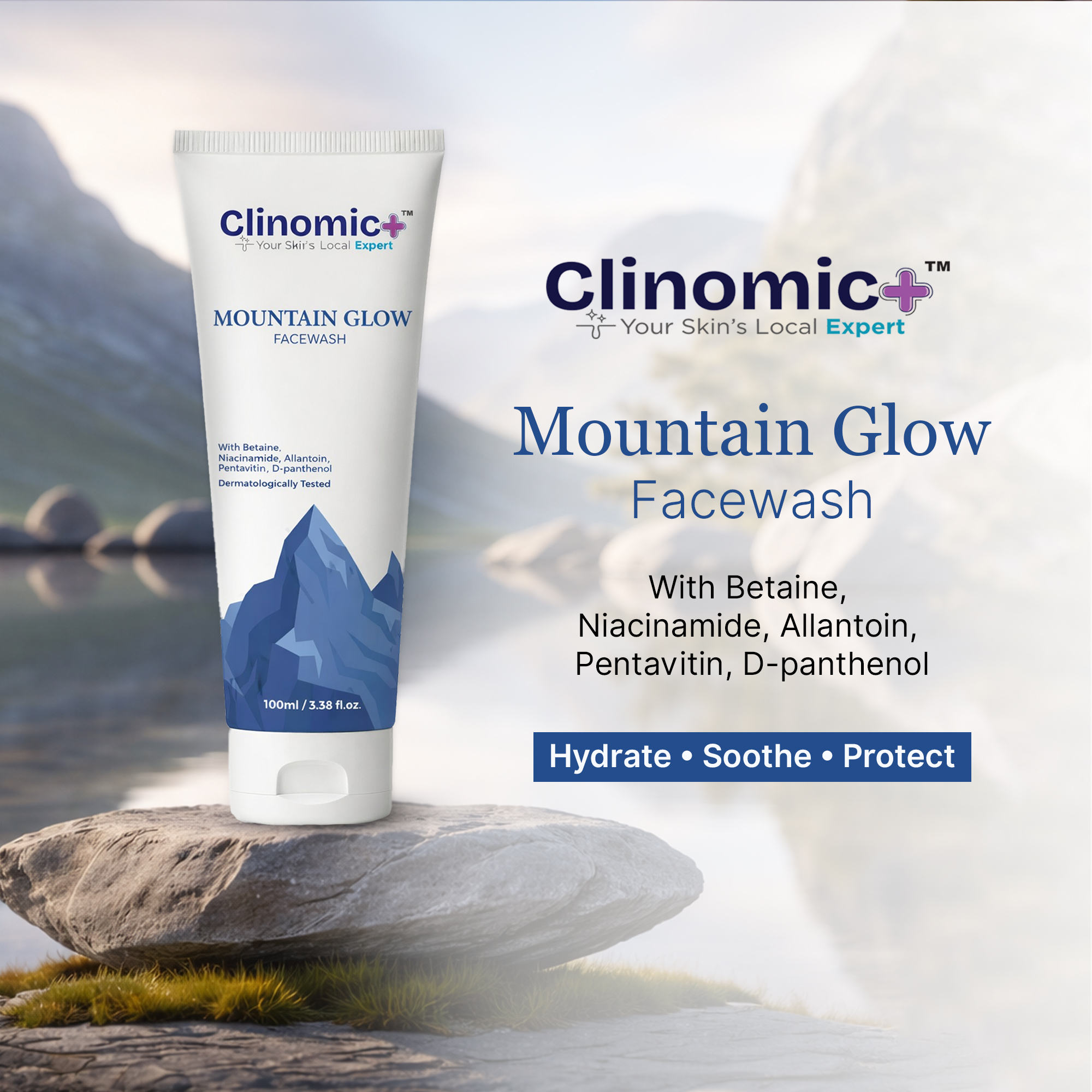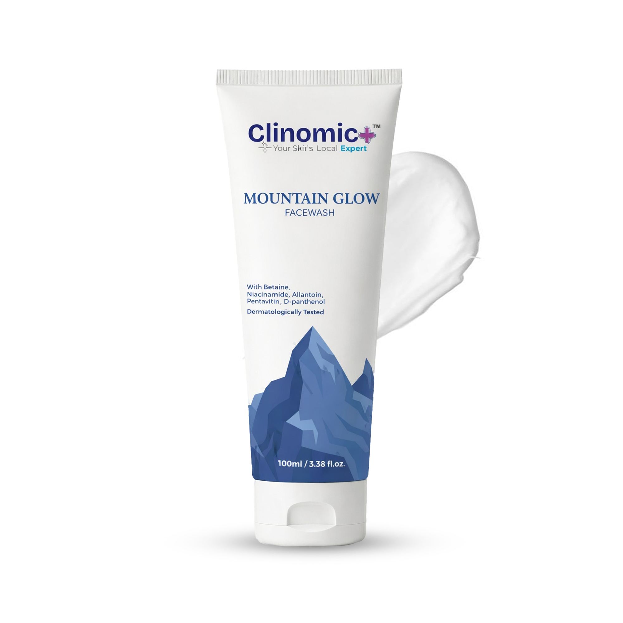 Clinomic Plus Mountain Glow Face Wash is a gentle, hydration-supporting cleanser designed for cold, dry, and harsh weather conditions. It effectively removes daily impurities while helping maintain the skin’s natural moisture balance, leaving skin feeling clean, soft, and comfortable. Formulated with moisture-binding ingredients like Glycerin and Pentavitin, it helps prevent post-wash dryness, while Betaine supports skin hydration in challenging climates. Soothing agents such as Allantoin and D-Panthenol help calm and protect the skin barrier, and Niacinamide promotes a smoother, healthier-looking complexion.Perfect for daily use, this cleanser keeps skin fresh, balanced, and naturally radiant even in winter and cold environments.