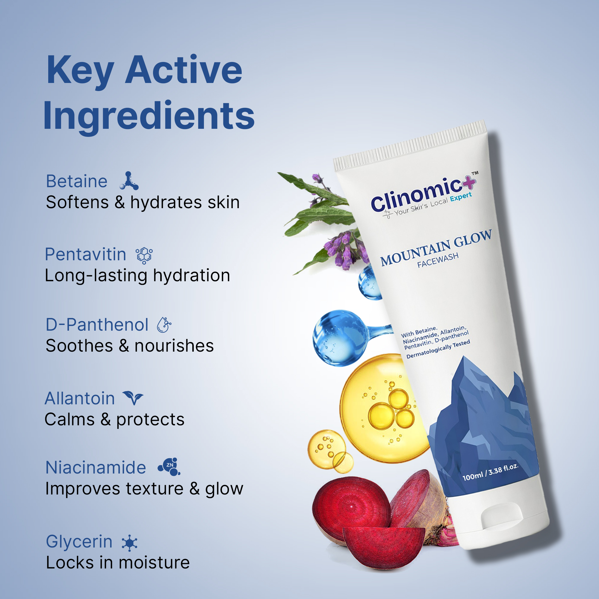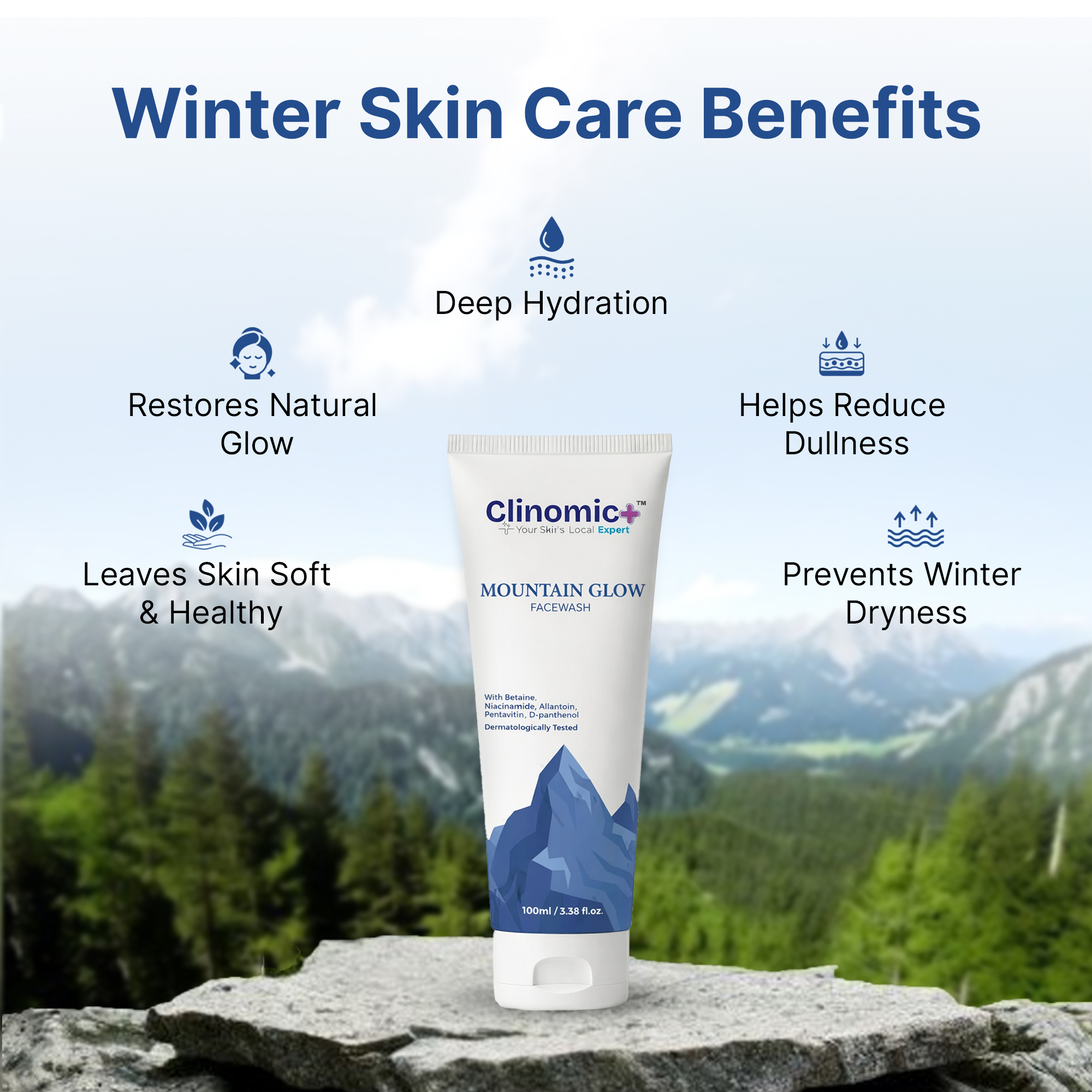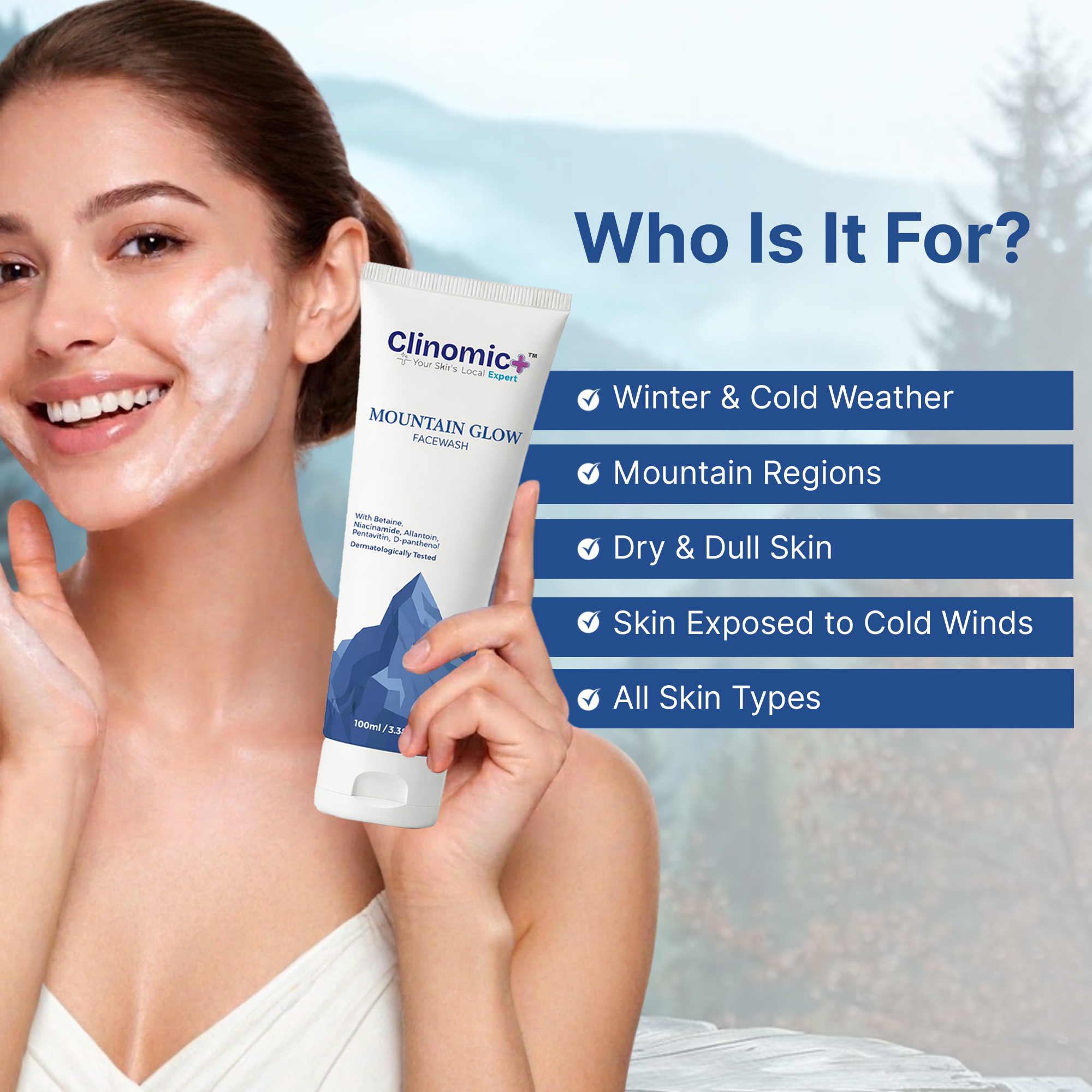 Clinomic Plus Mountain Glow Face Wash is a gentle, hydration-supporting cleanser designed for cold, dry, and harsh weather conditions. It effectively removes daily impurities while helping maintain the skin’s natural moisture balance, leaving skin feeling clean, soft, and comfortable. Formulated with moisture-binding ingredients like Glycerin and Pentavitin, it helps prevent post-wash dryness, while Betaine supports skin hydration in challenging climates. Soothing agents such as Allantoin and D-Panthenol help calm and protect the skin barrier, and Niacinamide promotes a smoother, healthier-looking complexion.Perfect for daily use, this cleanser keeps skin fresh, balanced, and naturally radiant even in winter and cold environments.