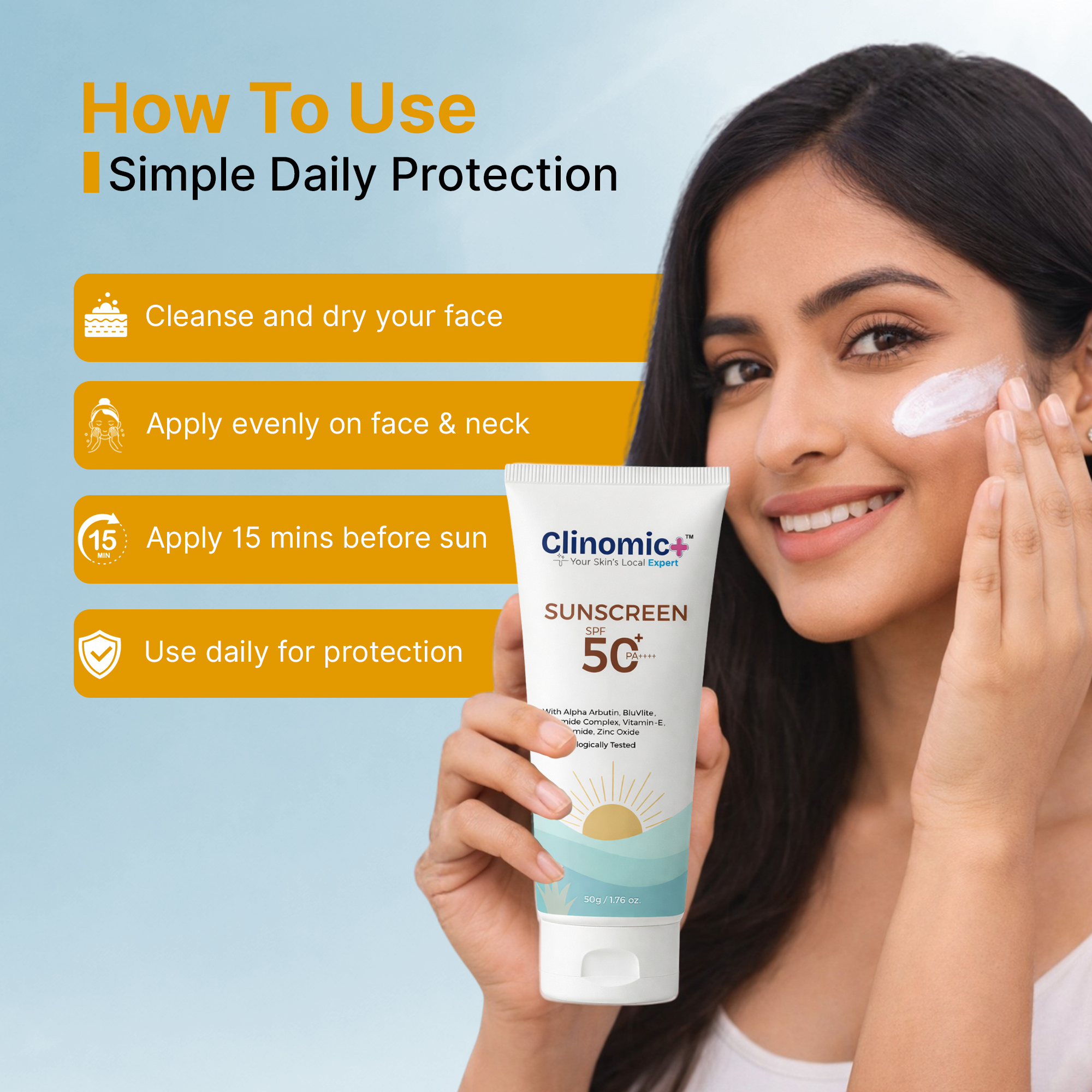1. Apply generously 15–20 minutes before sun exposure.